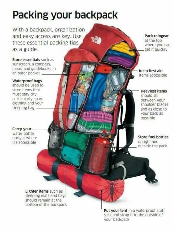 • Zona media e interior de la mochila: En este compartimento debe ir la ropa, la comida, hornillo y utensilios de cocina. Los elementos más ligeros, como la ropa, deben ocupar las partes inferiores, laterales y superiores. La ropa es mejor guardarla en una bolsa de tela impermeable para asegurarte que siempre este seca. La bolsa de comida, hornillo y utensilios de cocina, suele ser elementos que pesan más irán en la parte central y más cerca de la espalda.