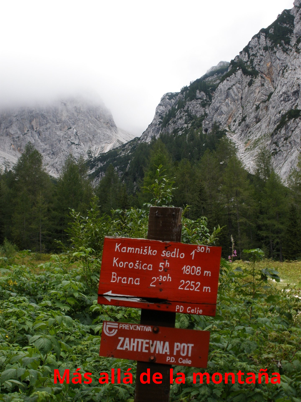 Pronto llegamos al borde de una pradera donde hay un cruce. Continuamos a la izquierda en dirección a lo largo de un camino que inicialmente sube moderadamente a través del bosque. El camino está completamente trazado. Pasamos el bosque y llegamos a una subida entre rocas. En esta subida hay unas abrazaderas de alambre y escaleras. La pendiente se aligera un poco, pero el camino aún es empinado y expuesto a la caída de rocas. Seguimos a delante y tras un breve ascenso de una repisa ancha y algo expuesta llegamos a las vastas laderas cubiertas de hierba. Desde aquí llegamos a un cruce donde continuamos a la derecha en dirección al Brana (izquierda se va a la cabaña Kamniška koča a unos 10 minutos).