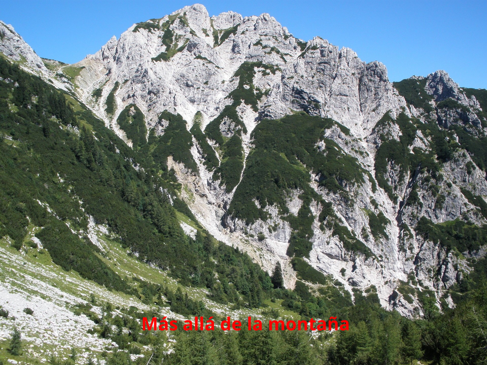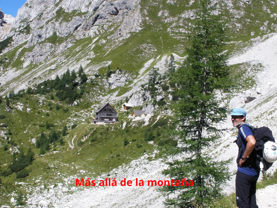 El sendero se dibuja en el terreno rocoso. En ocasiones disponemos de cables para agarrarnos en las zonas más expuestas. Otras veces trepamos por escaleras talladas en la roca. Bordeamos la montaña en dirección al Refugio Dom Planika divisando de frente la cara sur del Triglav. Es impresionante ver desde aquí el entorno al que nos dirigimos. Es todo roca.