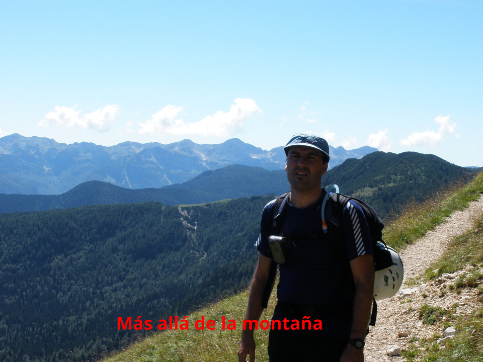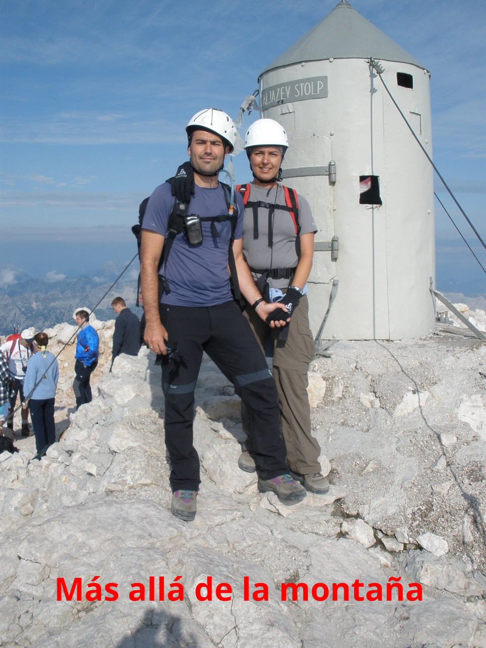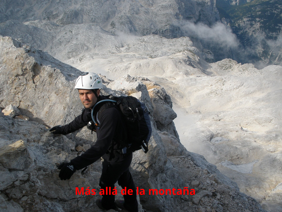 Desde ahora la mayor parte del camino era una suerte de cadenas con las que había que prestar atención en cada paso que dábamos pero que en ningún caso eran de gran dificultad. De todas maneras, al final de la cresta reinaba imponente el Triglav y para alcanzar su cima teníamos que trepar una pared completamente vertical. Para subir la pared usamos los arneses por seguridad y seguimos la vía ferrata hasta al final. A lo largo de la subida, vimos a muchos eslovenos sin casco y sin arnés, desafiando a la montaña en todas sus facetas. Está claro que locos hay en todos los lados.