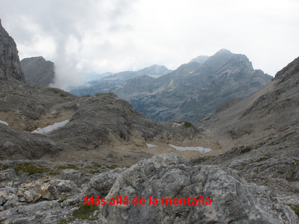 Reanudamos la marcha por el sendero trazado en la roca hacia el Valle de los Siete Lagos del Triglav. Ahora el Monte Triglav queda a nuestras espaldas. Este sendrero nos lleva a ascender el collado rocoso cercano a la cima del Kanjavec, a casi 2400 m.